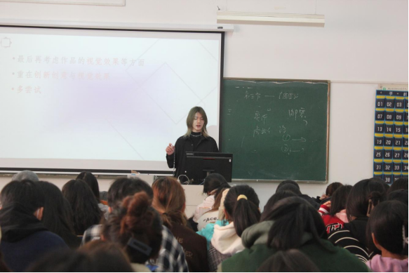 杨文君教授还详细介绍了视觉艺术设计赛事的组别——平面、动画、视频、UI设计。其中平面设计包括海报和吉祥物的设计,而UI设计则是第十三届大赛的新增项目。杨文君教授指出,不同的参赛项目获奖的几率不同,而国内多数重点高校会从电子软件方面入手,我院参赛同学可以侧重视觉艺术方面,设计理念是真正的致胜关键。