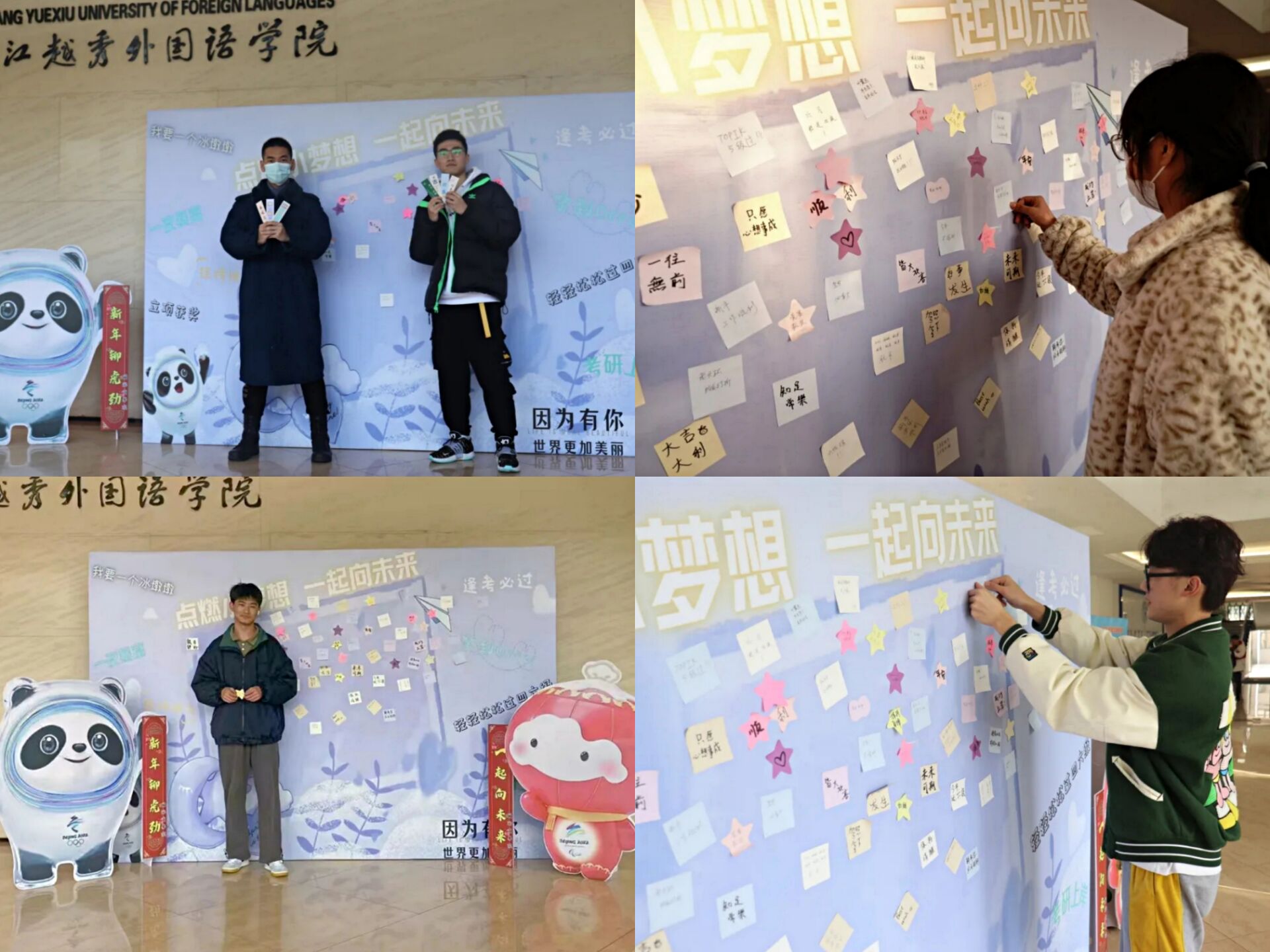 新学期报道之日,学院还准备了一系列趣味活动,喜迎商院学子返校。可爱的奥运会吉祥物冰墩墩、雪容融带着“新年铆虎劲,一起向未来”的祝福与我们一同点燃小小的梦想,返校学生可以与它们一起合影,记录快乐时光。一个个幸运签寓意着同学们好运连连、平安喜乐;一份份新学期梦想书写着青春力量、美好理想。