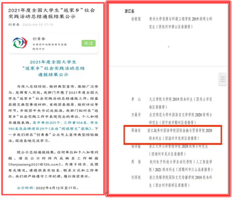 国际金融与贸易学院投资学2002班邵海钰同学在2021年利用寒暑假节日期间时间,积极组织温籍在校大学生,参加助力家乡“乡村振兴计划”建设。