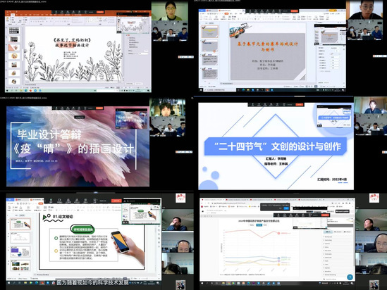在答辩过程中,新闻传播类、数字媒体技术专业采用“学生汇报+教师评价”的同步在线模式,数字媒体艺术专业采用“答辩视频录制+教师评价”的异步在线模式。答辩学生准备充分,从选题背景、论文(设计)思路、研究(设计)方法、成果创新等方面进行了精彩展示。答辩组教师仔细审阅学生材料,对学生的论文(设计)进行了认真点评,指出了修改意见和建议,经集体商议给出学生最终答辩成绩。答辩过程全程录屏,规范有序、公平公正,既有答辩现场的仪式感,同时也保证了工作的严肃性。
