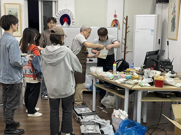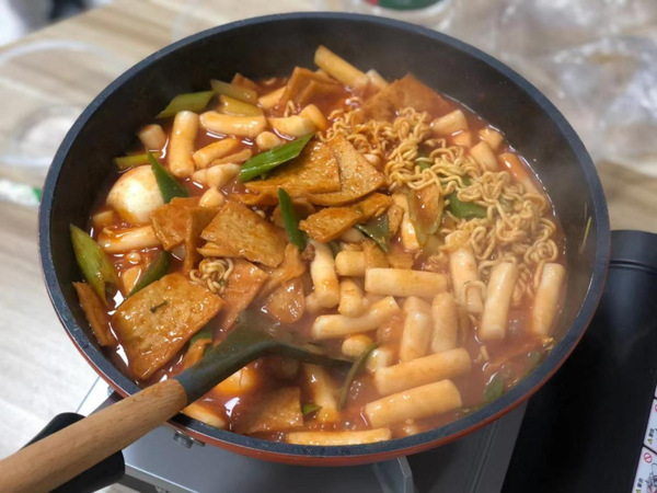 随后,同学们有条不紊地亲身实践,兴致盎然地体验韩国饮食文化。首先准备食材,将年糕块放入水中浸泡两到三分钟后掰开,大葱切段,鱼豆腐切片,鸡蛋剥壳,放碗中备用;锅中倒入适量清水,依次加入韩式辣酱、牛肉粉和辣椒粉等辅料以及大葱,搅拌均匀后大火煮开;接着将年糕放入锅中,煮至年糕浮于水面,再将拉面和鸡蛋放入锅中,加入少许白糖调味,中火焖煮3—5分钟即可出锅。制作过程中,同学们分工合作,虚心听取外教老师的指导。随即渐入佳境,越发娴熟,一翻一舀,色泽鲜亮,有模有样。霎时间,体验馆中香味扑鼻。