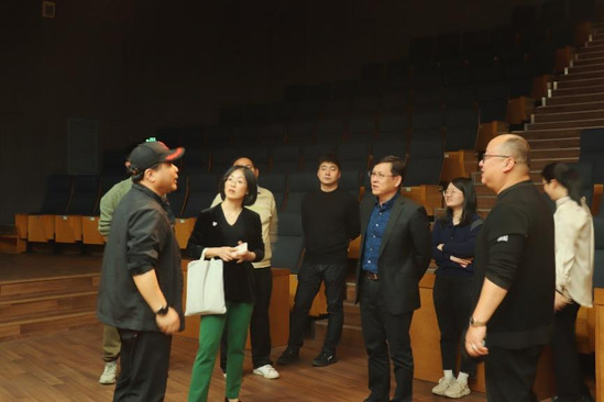 何海翔院长带领参会一行实地考察正式启动仪式应用舞台,罗治林导演就现场舞台设计、节目背景与灯光问题给出宝贵意见,同时也参观了学院展廊及实验教学中心,以更好地了解学院文化,增强合作信心。