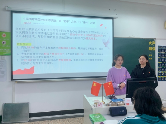 今年的五四青年节恰逢共青团建团100周年,20余名党员同志到16个大一班级开展活动。他们结合自身例子、时代热词,呼“躺平”之名,行“奋斗”之实,以及一些自身的教官队训练经历、竞赛经历、志愿服务经历等,向同学们生动阐述了当代青年人的历史使命、奋斗使命,呼吁同学们不要虚度光阴,应尽情书写自己的青春之笔。