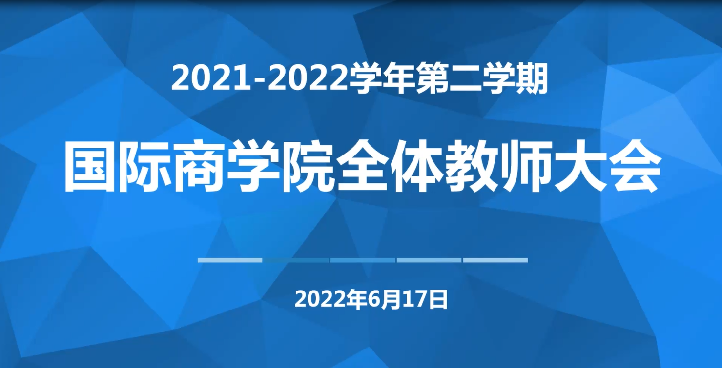 6月17日下午,国际商学院召开2021-2022学年第二学期期末教师线上会议。杨小平院长、李建凤书记、王佳桐副院长、孙一得副院长、凌玮副书记等全院教职工参加了会议,会议由杨小平主持。