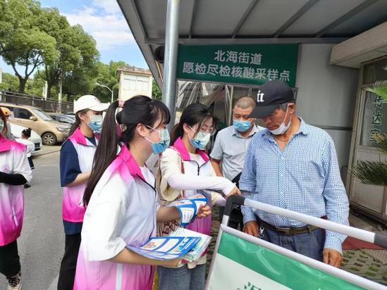 在北海街道卫生服务中心,实践服务队成员协助做好核酸检测现场秩序引导工作。他们耐心提醒居民朋友:戴好口罩,保持一米线距离,确保等候群众安全有序不聚集,提醒居民提前打开健康码,确保采样工作迅速有序,为战疫工作贡献自己的力量。