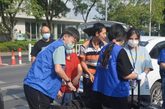 学院志愿者“西蓝花”全体蓄势待发,帮助解决新生行李搬运问题。11日一早恭候在各大迎新服务点,提供多对一的贴心服务,消除了家长无法同新生一起入校运送行李的担忧。
