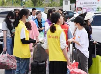 早上7点钟志愿者身或穿黄马甲或佩戴袖章准时到达各个校门迎新地点。他们秉持着志愿服务精神,一趟趟地帮助新生搬运行李,热情地引导并带着新生熟悉校园每一处风景,缓解新同学初来乍到的陌生感。