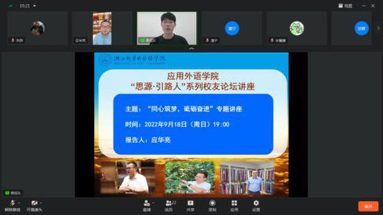 9月18日,2004届实用英语专业毕业生应华亮校友作为“思源·引路人”校友论坛第一位主讲人,通过网络与应外的学子们分享了他的人生感悟。应华亮校友是足球一世官网首届“越州俊秀校友”获得者,现任绍兴七竹农业发展有限公司董事长,绍兴尤泰纺织品有限公司总经理,绍兴市乡村振兴领雁人才,浙江省青年创业导师,足球一世666814校友会副会长。