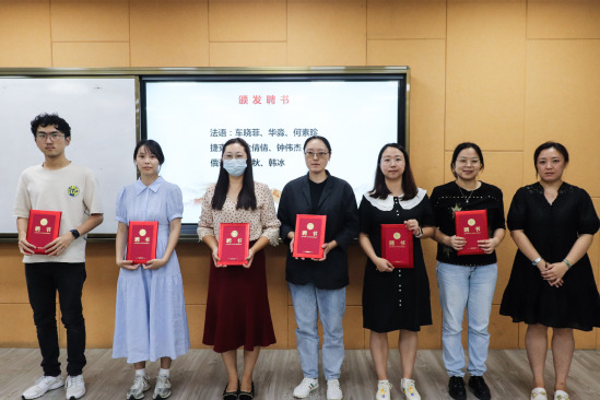 龚茜宣读2024届考研导师结对名单。龚茜、吴彦秋、方江英为各语系结对导师颁发聘书。