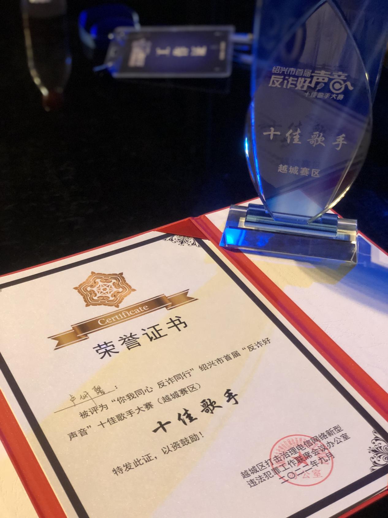 祝贺来自我院21应西1班的卢妍馨同学在此次比赛中彰显实力,取得越城赛区总分排名前三的好成绩,并获得“你我同心 反诈同行”绍兴市首届“反诈好声音”十佳歌手大赛(越城赛区)的十佳歌手称号!此后,卢妍馨同学将代表越城区参加绍兴市总决赛。