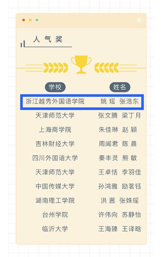 经过专家评委的严格评审,我院朝鲜语专业梁佳杰组合的参赛作品《그곳을차마꿈엔들잊을리야》(指导教师:金爱花)画面优美、语音流利且极具感情、制作精良,令人眼前一亮,获得了评委们的一致好评,荣获本次大赛的一等奖!姚瑶、张浩东组合(指导教师:王永准)获得人气奖。