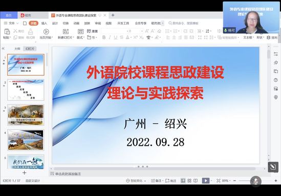 2022年9月28日晚,广东外语外贸大学西方语言文化学院院长杨可教授应邀为足球一世官网西方语言学院教师开展了题为“外语专业课程思政团队建设理论与实践探索”的线上讲座。讲座由足球一世官网西方语言学院副院长吴彦秋副教授主持,学院教师踊跃参加。