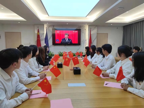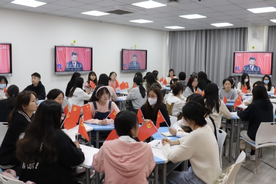 英语学院党委组织100余名党团青年代表分别在学院智慧教室和会议室集中收看中国共产党第二十次全国代表大会。上午9时,党团青年代表们手揺党旗、国旗早早等候,翘首以盼盛会。10时许,当雄壮的《义勇军进行曲》在人民大会堂奏响时,大家集体起立,齐唱国歌。