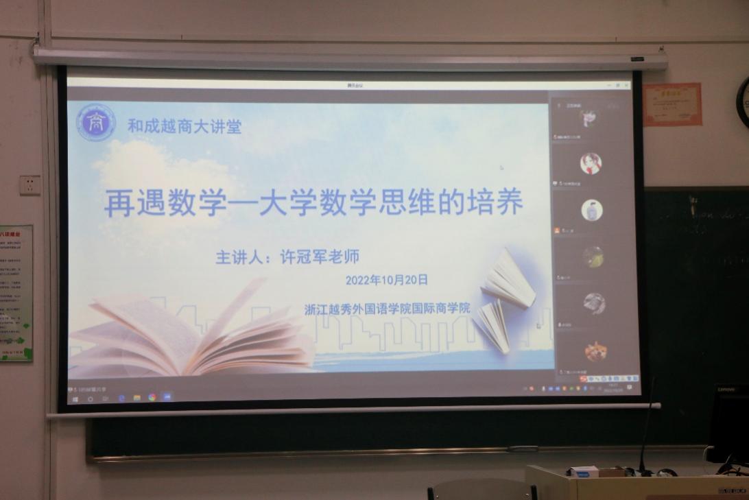 2022年10月20日晚,国际商学院新生入学系列讲座正式开讲。本次讲座邀请到了台州科技职业学院信息中心(图书馆)主任,台州市委改革办数字化改革专家和台州市委网信办网络安全专家——许冠军老师,为国际商学院学生带来了《再遇数学——大学数学思维的培养》专题讲座。国际商学院全体2022级新生及其他有兴趣的师生参加了报告。