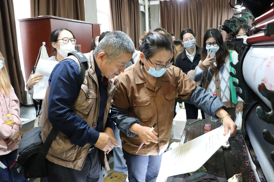 在印刷车间,学生亲眼目睹了制版印制的全过程。工作人员向学生们讲解了工作的流程,杜教授还与学生一起分析讨论印刷过程中纸张上出现的瑕疵,这些是在课堂上很难接触到的宝贵体验。