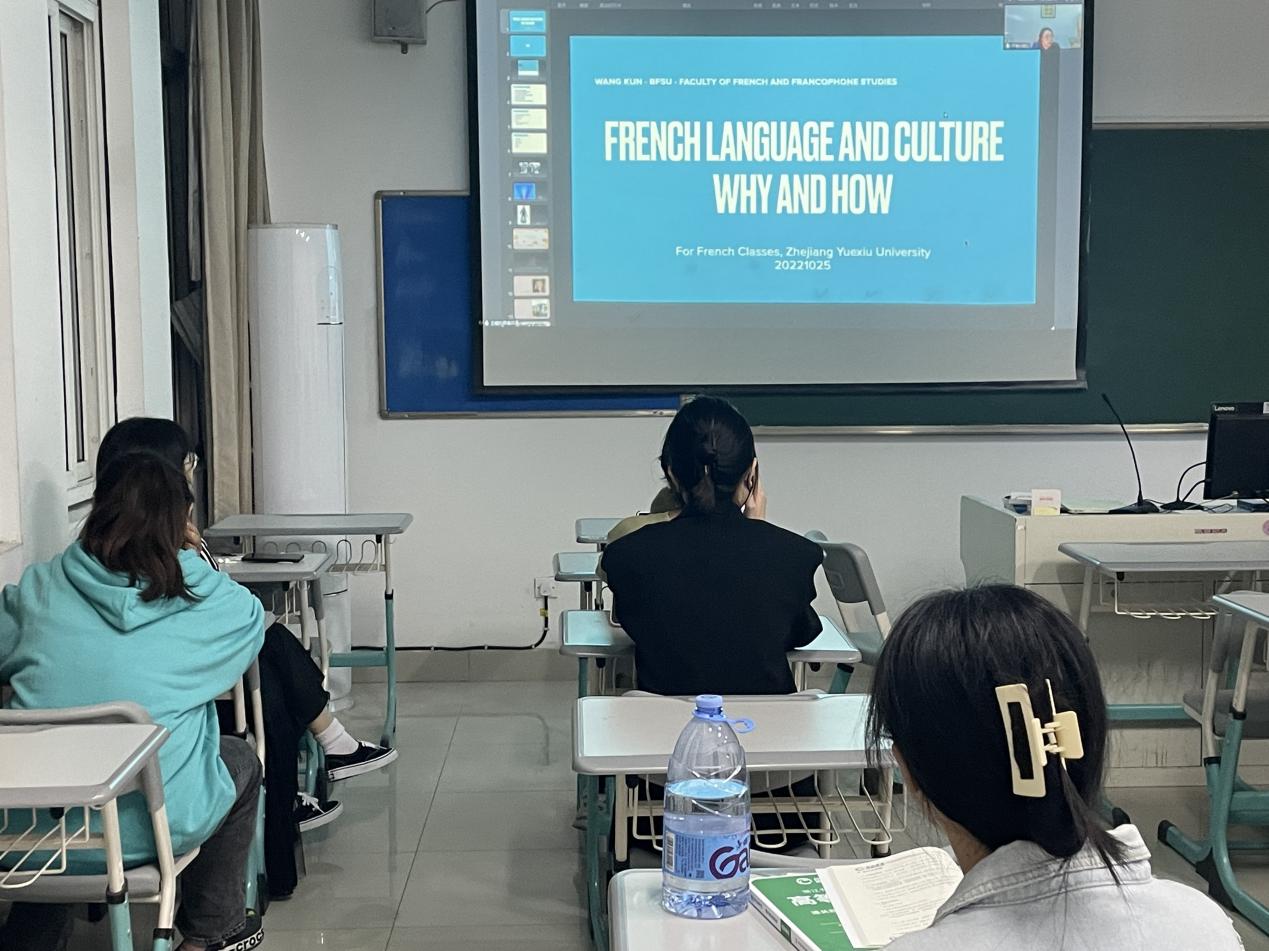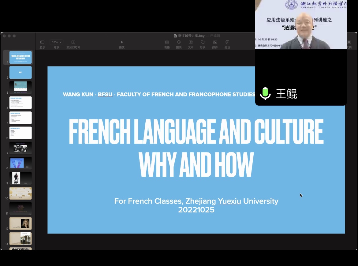 为提升应用外语学院应用法语系同学的学习热情,交流分享法语学习方法、职业生涯规划,应用法语系于10月25日晚举行始业教育系列讲座之“法语学习导论”讲座。本次讲座以线上腾讯会议形式展开,由北京外国语大学法语语言文化学院副院长王鲲老师主讲,应用外语学院副院长、应用法语系系主任胡燕静老师主持。应法系全体师生共150余人在各自教室观看了本次讲座。