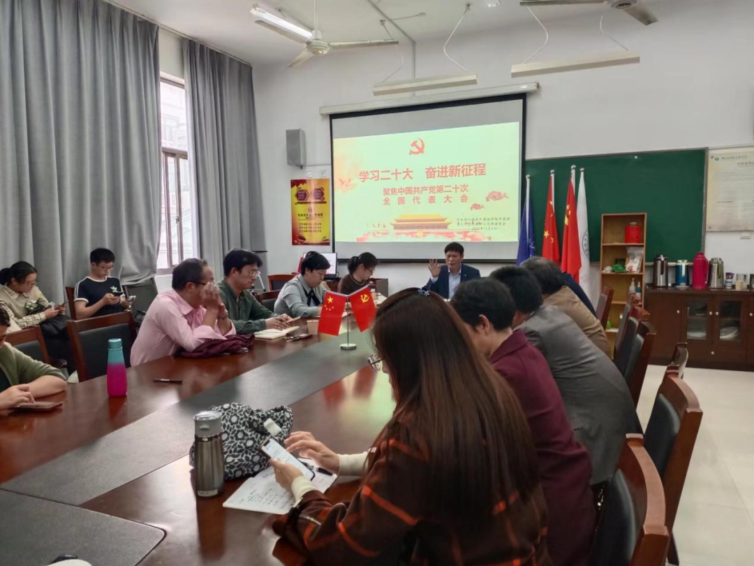会议指出党的二十大是在迈上全面建设社会主义现代化国家新征程、向第二个百年奋斗目标进军的关键时刻召开的一次十分重要的大会,具有重大的政治意义、理论意义、实践意义和历史意义。习近平总书记作的报告,回顾总结了过去五年的工作和新时代十年的伟大变革,阐述了开辟马克思主义中国化时代化新境界、中国式现代化的中国特色和本质要求等重大问题,擘画了全面建设社会主义现代化国家、全面推进中华民族伟大复兴的宏伟蓝图和实践路径,是党团结带领全国各族人民夺取新时代中国特色社会主义新胜利的政治宣言和行动纲领,是闪耀着马克思主义真理光芒的纲领性文献。会议要求全体教职工及党员同志要将学习贯彻二十大精神作为当前和今后一段时间的首要政治任务,不断提高政治站位,牢牢把握党的二十大提出的重要思想、重要观点、重大战略、重大举措,深刻领悟“两个确立”的决定性意义,增强“四个意识”、坚定“四个自信”、做到“两个维护”,自觉在思想上政治上行动上同以习近平同志为核心的党中央保持高度一致。同时要求全体教职工和党员同志要把学习成效转化为推动学院事业发展的强大动力,落实到人才培养、教学、科研、管理和服务中去,全面落实立德树人根本任务,践行为党育人、为国育才的初心使命,踔厉奋发,勇毅前行。