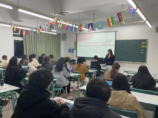 为认真学习宣传贯彻党的二十大会议精神,持续在全院党团青年中掀起学习热潮,英语学院党委组建大学生党员宣讲团,于2022年12月5日-9日开展党的二十大精神宣讲活动。宣讲团由冯豪挺、陈涣璐、占心雨、戴徐倩等16名大四的学生党员组成。本次活动也是学院“党建带团建、团建促党建”主题活动之一,宣讲覆盖32个班级、900余名团员青年。
