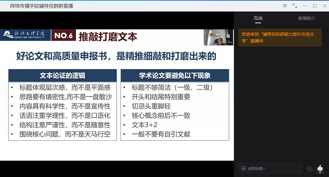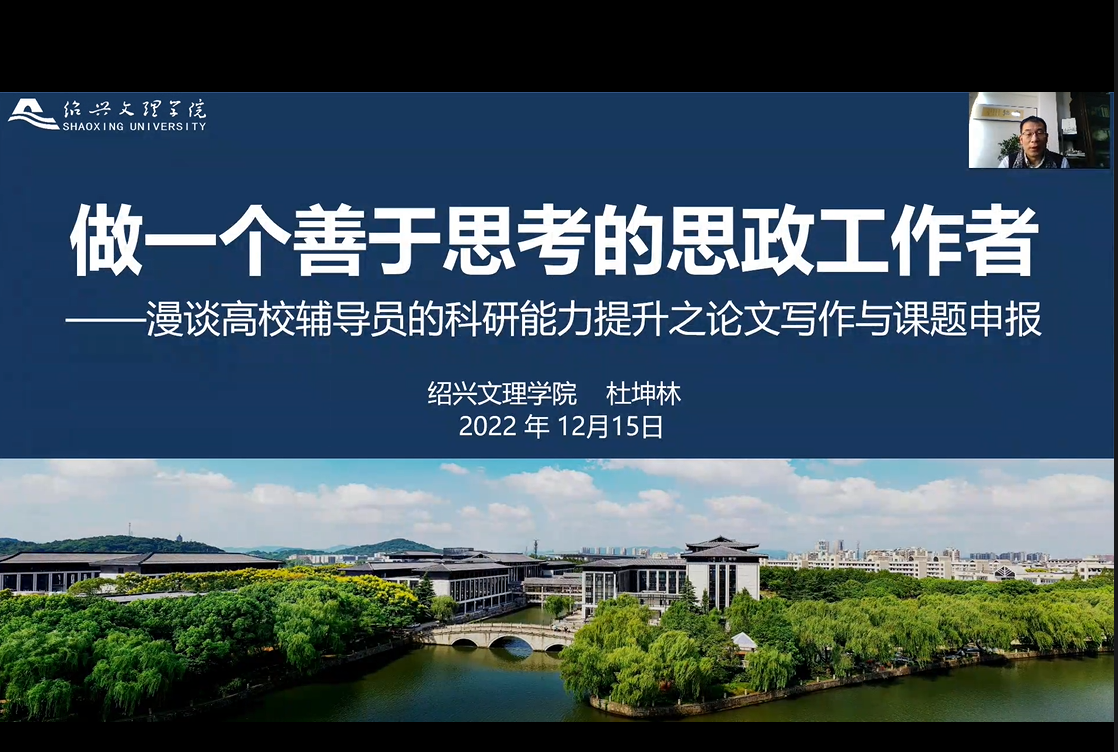 党的二十大报告指出:“青年强,则国家强。当代中国青年生逢其时,施展才干的舞台无比广阔,实现梦想的前景无比光明。全党要把青年工作作为战略性工作来抓,用党的科学理论武装青年,用党的初心使命感召青年,做青年朋友的知心人、青年工作的热心人、青年群众的引路人。”加强高校辅导员队伍专业化、职业化建设,提升高校辅导员的科研意识与科研能力就显得尤为重要,12月15日下午,网络传播学院邀请了绍兴文理学院发展规划处处长杜坤林教授为学院辅导员开展了一场以辅导员科研意识培养与科研能力提升的专题网络培训。