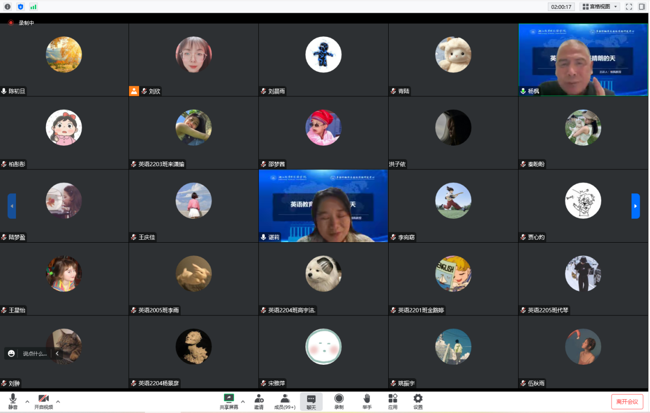 杨教授首先以过来人身份回忆了曾经的艰苦学习经历,对于目前唱衰英语专业的现象持不同看法,认为外语专业依然是热门专业,英语专业学生应珍视,并从英语的价值和功能两方面进行了细致阐述。杨教授指出语言是知识的承载,是外语学习者的生存工具,具备较好的外语素养可以增加自身职业力和专业竞争力;语言可以认识世界,逼近事实和真相,通过对比世界的差异认清事物本质,辩证思考问题;语言是建构知识的能力体现,通过引用福柯的“词与物,词与事,词与人”指出社会上的规则大多是由英语定义,英语具有其“本体性”,“霸权性”及“政治性”。杨教授通过所做的实验结论表明:外语学习者的语言水平可以达到其母语程度。同时也介绍了“一万小时”理论,即通过听说读写的定量训练对能力加以固化。教授进一步结合自身经历为当代大学生的外语学习提出了八点建议,强调除思辨能力、分析能力、辩护能力、试验能力外,目前大学生最应获取的是表达能力、社会交际能力、情感能力和艺体能力。杨教授生动的讲述了曾要求博士生背诵《经济学人》,发现了其惊人的表达变化;建议同学们应放下手机,参与到各种校内外活动中;通过各种社交方式锻炼与人的交往;培养上瘾的、有趣的、有闲的兴趣能力调节情绪。在互动环节,我院师生从英语学习的具体方法、思政与英语学习的有效融合、学习与压力的平衡关系、情绪能力的提升等方面提出了问题,杨教授根据自身的宝贵经验进行了真诚细致的解答。此外,杨教授还邀请我院教师参加其接下来的翻译主题讲座,并表达希望与我院师生线下见面,快意畅聊的愿望。