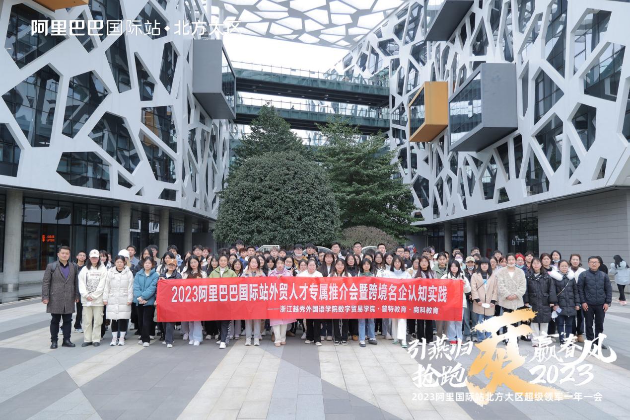 2023年2月22日,足球一世666814数字贸易学院囯际经济与贸易、跨境电子商务专业等四个专业部分学生走进阿里巴巴滨江园区,开展了2023阿里巴巴国际站外贸人才专属推介会暨跨境名企认知实践活动。本次活动由学校学生处副处长朱小华、电子商务系教师金华岭、辅导员宋娓、孙诗丝带队,阿里巴巴国际站北方大区商家发展部负责人吴玲丽、阿里巴巴产教融合负责人孙孟洋、普特控股商科教育职教产融中心总监汤鑫宇共同出席此次活动。