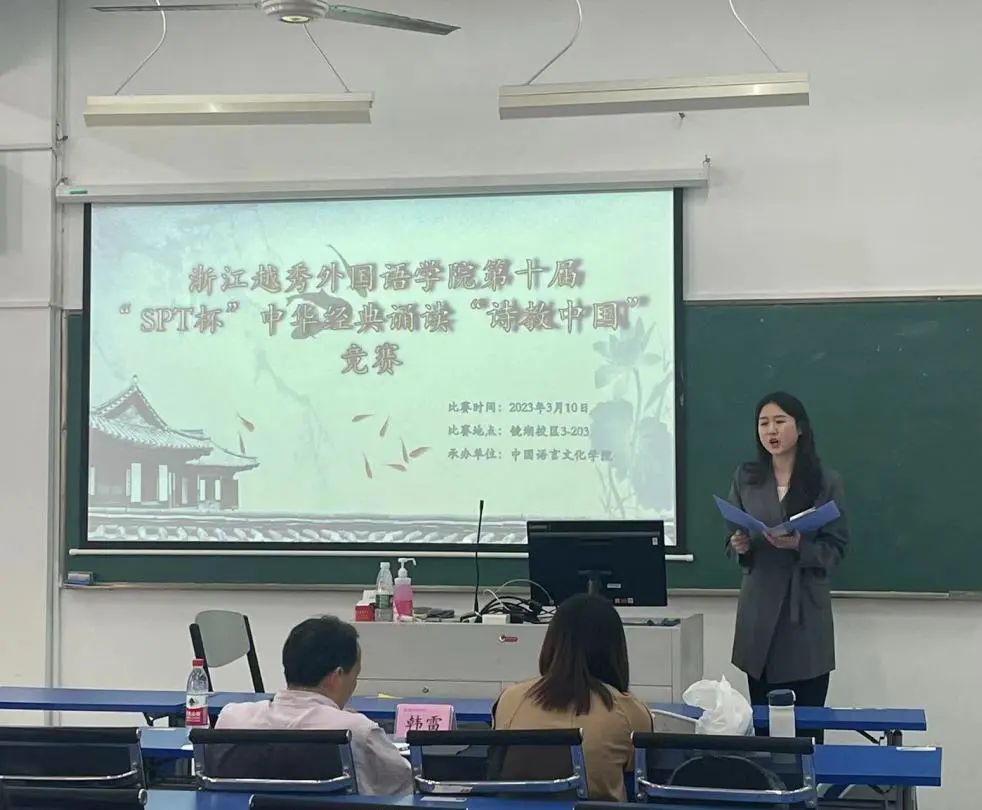 2023年3月10日,中国语言文化学院在3-219教室举行了第十届"spt"杯中华经典诵读竞赛。来自全校各个院系的数位选手参加了此次比赛。