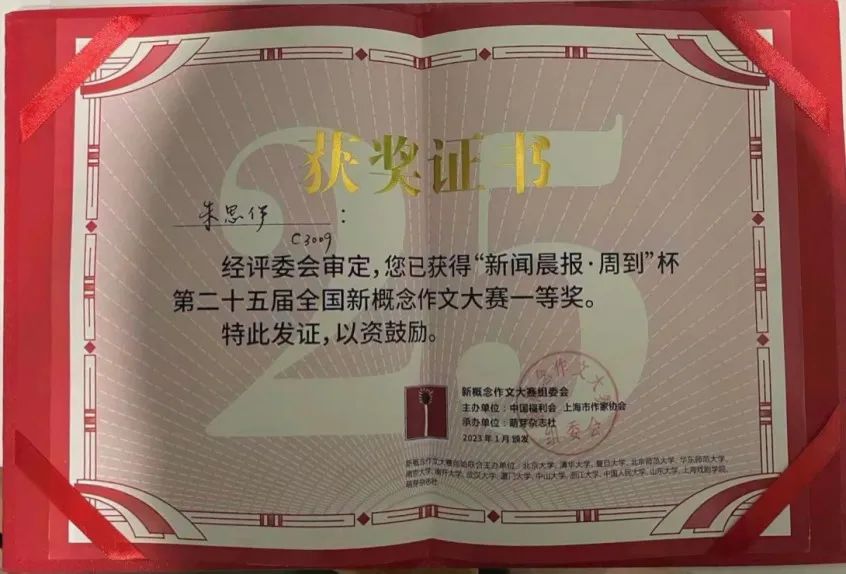 在“新闻晨报·周到”杯第二十五届全国新概念作文大赛中,我院戏剧影视文学2101班朱思伊同学投稿文章受到大赛主办方认可,荣获一等奖。
