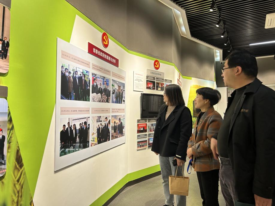 陈智校友带领李建凤书记一行人参观了浙江省农业科学院技术转移中心、产品销售处、院史馆等地,通过工作人员的讲解和介绍,了解了浙江省农业科学院创立的背景、“科技产业化、产业科技化”的具体举措和经验做法,以及农创园的入住条件和入驻企业情况。