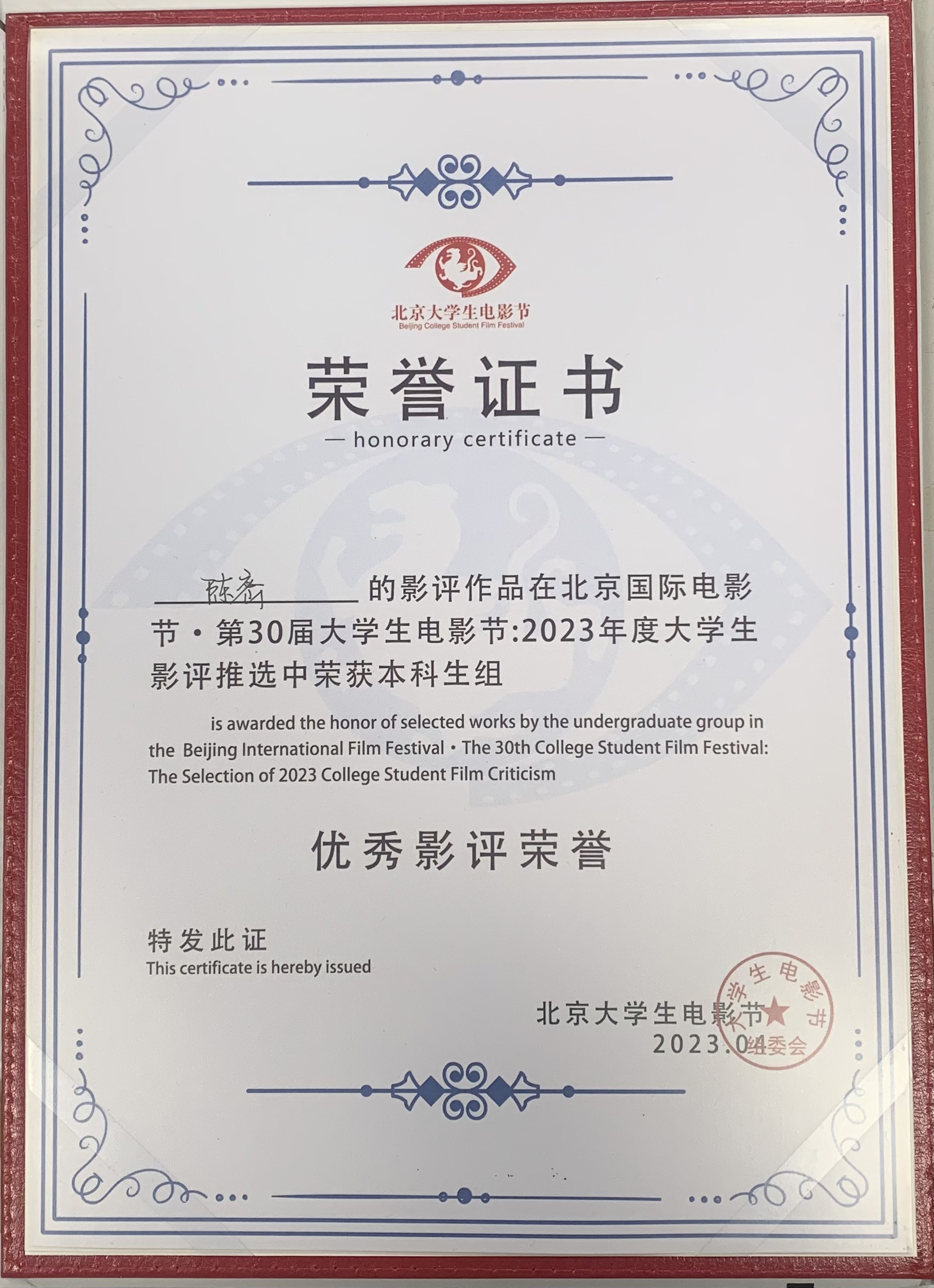 北京国际电影节·大学生电影节创立于 1993 年,至今已成功举办 29 届,始终秉承“青春激情、学术品位、文化意识”的十二字宗旨,坚持以“大学生办、大学生看、大学生评、大学生拍”为特色,奠定了其不同于其他电影节的独特品格。北京大学生电影节2023年度大学生影评推选突出“大学生评”的特色,致力于激励大学生群体对中国电影的关注和热爱。本届影评推选收到作品800余篇,经过匿名推选,共有75篇作品入选最终轮推选,其中本科生组入选35篇,研究生组入选40篇。最终本科组获奖7名。