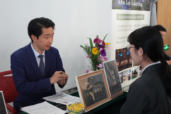 同学们参会热情高涨,现场人头攒动。在紧张而热烈的氛围中,同学们展示了优秀的专业素养,身着正装,从容不迫地与各个HR进行交流。在酒店的中英双语面试中,也展示了酒店管理学院学生出色的口语能力,给酒店HR留下了深刻的印象,而2021级酒店管理专业的同学们也在此次双选会上纷纷找到心宜的岗位与酒店。