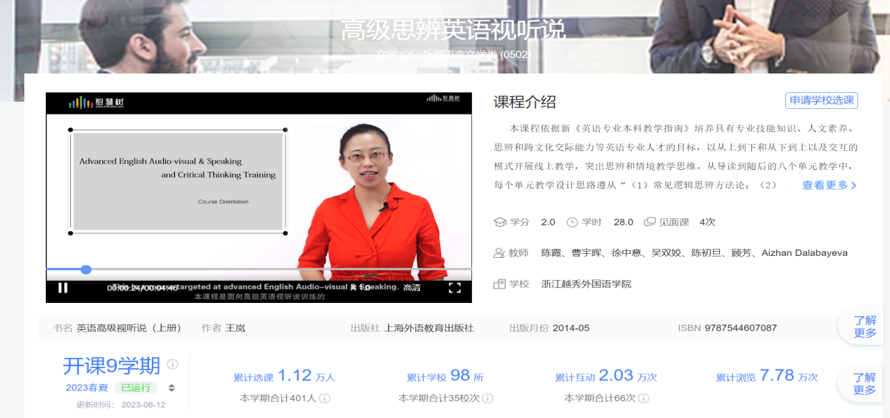 “高级英语视听说”是英语类高年级专业选修课程。课程基于OBE理念和立德树人总目标,结合自建智慧树500分钟线上课程“高级思辨英语视听说”和湖南师范大学国家级一流课程“英语演讲与辩论”,开展了线上线下混合式教学实践。该课程为首批校级线上精品开放课程、市级精品线上开放课程,并依据早期的建设积累获得了绍兴市教学成果奖二等奖,校级教学成果奖一等奖等奖项。2020年获批浙江省线上线下混合式一流课程。该课程为本校国家级一流本科专业翻译专业和浙江省十二五新兴特色专业英语专业的一门任选课。为更好的服务与长三角地区外向型经济特点,立足于培养英语复合型国际化人才的校本目标,本混合教学课程制定了“知识-能力-思维-价值”四维一体目标,开展探究性专题教学、研究性合作学习,促进学生语言高阶听说能力发展、人文素养全面发展,在外语教育中推进全人教育,实现立德树人。迄今为止,经过8个学期完整的教学实践,校内外累积有98所院校、共计11000多名学生参加了本课程线上线下混合式学习。课程建设突出听说与思辨的融合训练需求,以双创训练和社会语言服务等为教学导向,曾代表足球一世666814获得第五届全国混合式教学大赛决赛二等奖等奖项,获得了学生的一致好评。