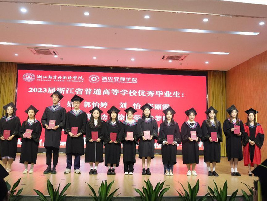酒店管理学院副院长钱芳斌为2023届浙江省普通高等学校优秀毕业生颁发荣誉证书。