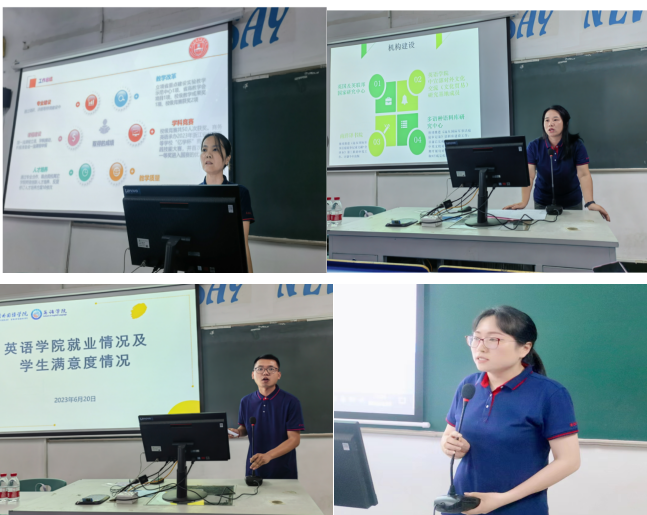 会上,张玉宏副院长、谌莉副院长、俞科安副书记,综合办华晓霞主任对各自负责的相关工作进行了总结汇报。张玉宏主要对本学期的教学工作进行了总结,指出存在的不足,并对期末阶段的监考纪律、阅卷规范、材料归档等工作进行了细致布置。谌莉则围绕成果培育、机构建设、申硕冲刺、学术交流等方面进行了汇报,并叮嘱老师们要未雨绸缪,学会时间管理,利用假期多做科研。俞科安汇报了2023届毕业生的就业情况和往届学生满意度情况进行了分析,强调各系各办要协同合作,做好学生服务与管理工作,提升学生的就业率与满意度。华晓霞向全体教职工通报了2022年学院各项经费使用情况及讲解了学院等各项经费报销的流程。