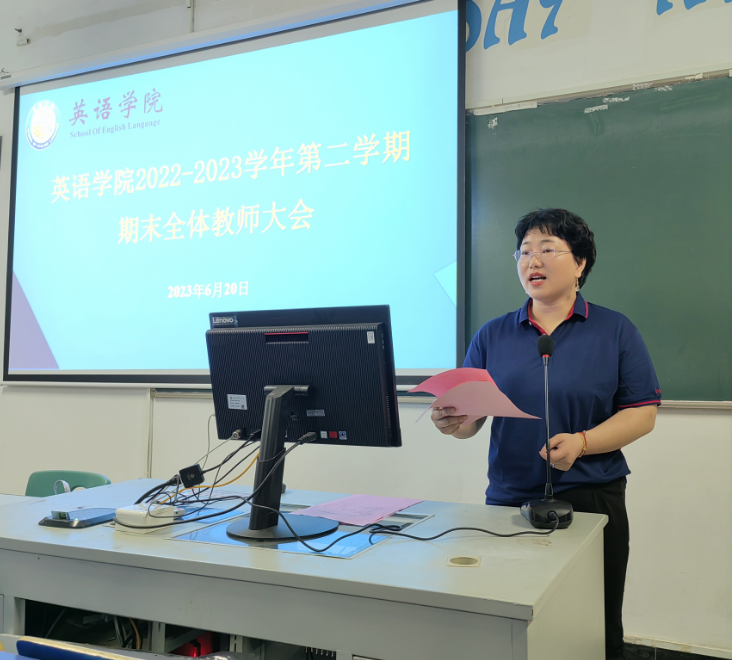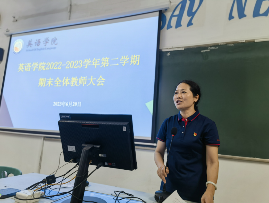 会上,陈科芳院长对全体教师一学期来的辛勤工作与无私付出表示了感谢,总结了学院在教学、科研、学科竞赛等方面取得的可喜成绩,她指出在课程建设上,我院陈霞老师《高级英语视听说》立项了第二批国家级线上线下混合式一流本科课程,使我院拥有了两门国家级一流课程,是我院狠抓教学质量内涵提升结出的又一硕果,为英语学院持续深度推进“金课”建设打下了扎实基础。会上,陈科芳院长也指出了学院在教学与管理中的不足之处,要求在暑假中各部门多总结验,把工作做得更细更实。最后,对于ChatGPT给教学和科研带来的冲击,陈科芳院长强调,我们老师要有成长与学习的紧迫感、危机感,要主动学习与ChatGPT链接,完成自我智能、自我生命的进化升级,改革创新我们的教学与育人。