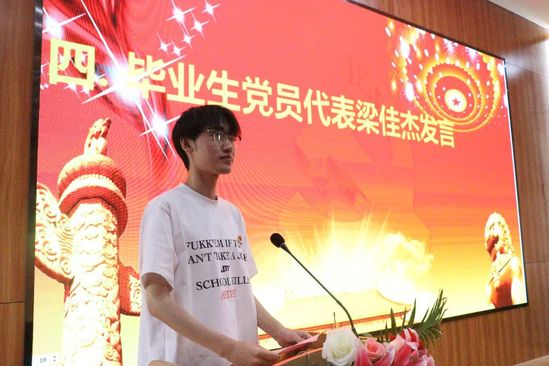 毕业生党员代表朝鲜语1903班梁佳杰代表毕业生党员在会上发言。他表达了对全院辛勤工作、无私奉献的领导们和老师们的深深感谢和崇高敬意。其次,他讲述了在越秀四年以来的学习和生活情况,分享了自己在成为一名合格的党员过程中的所思所感。他表示,作为一名合格的党员,要时刻保持党员的先进性,要敢于作表率,担责任,勇作为,践行一名共产党员的职责和使命。
