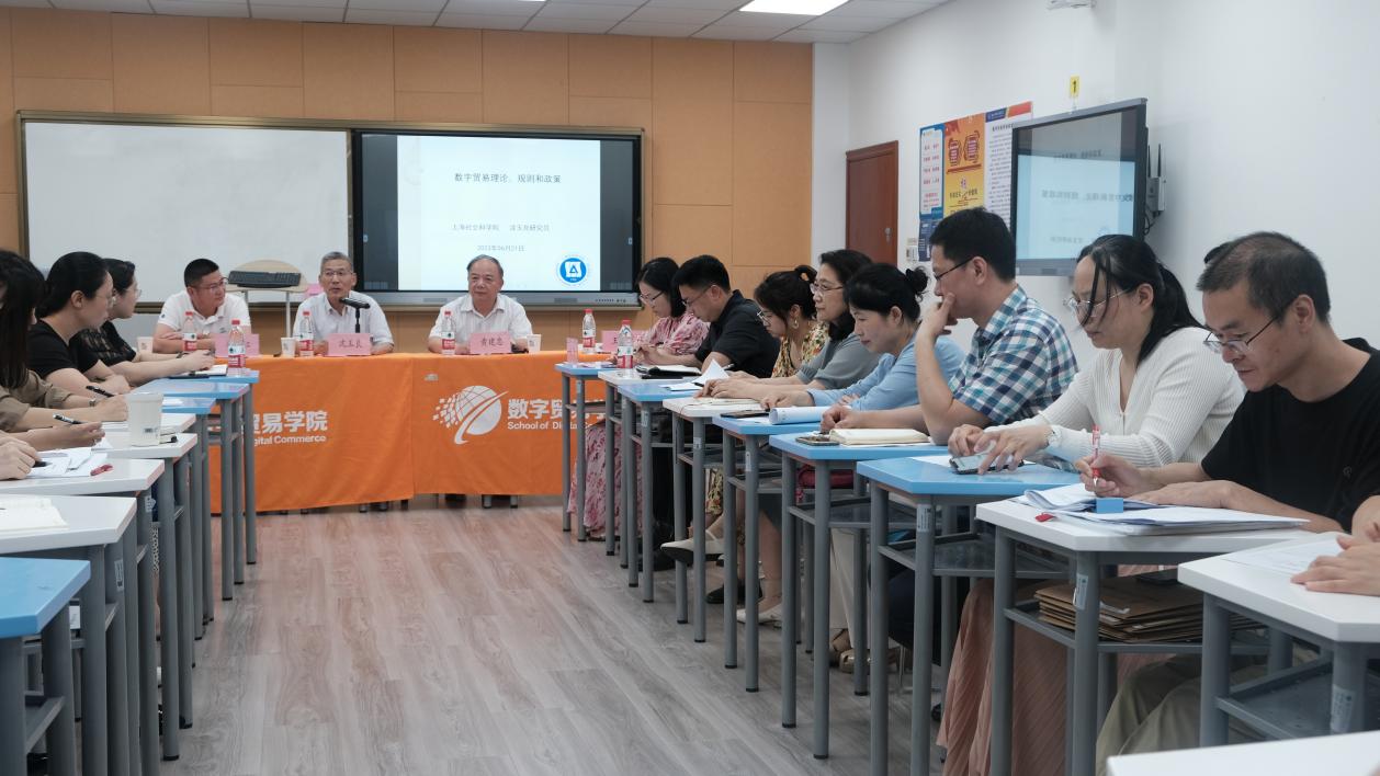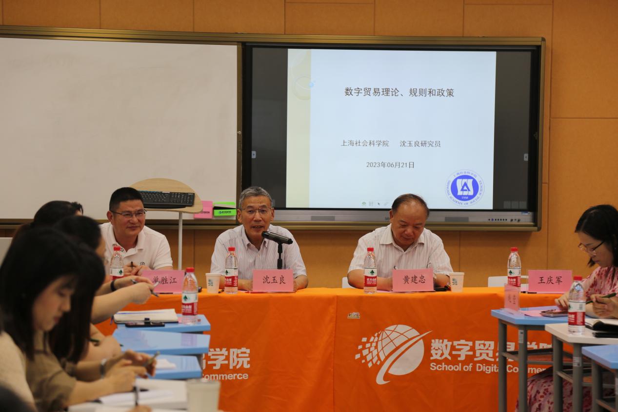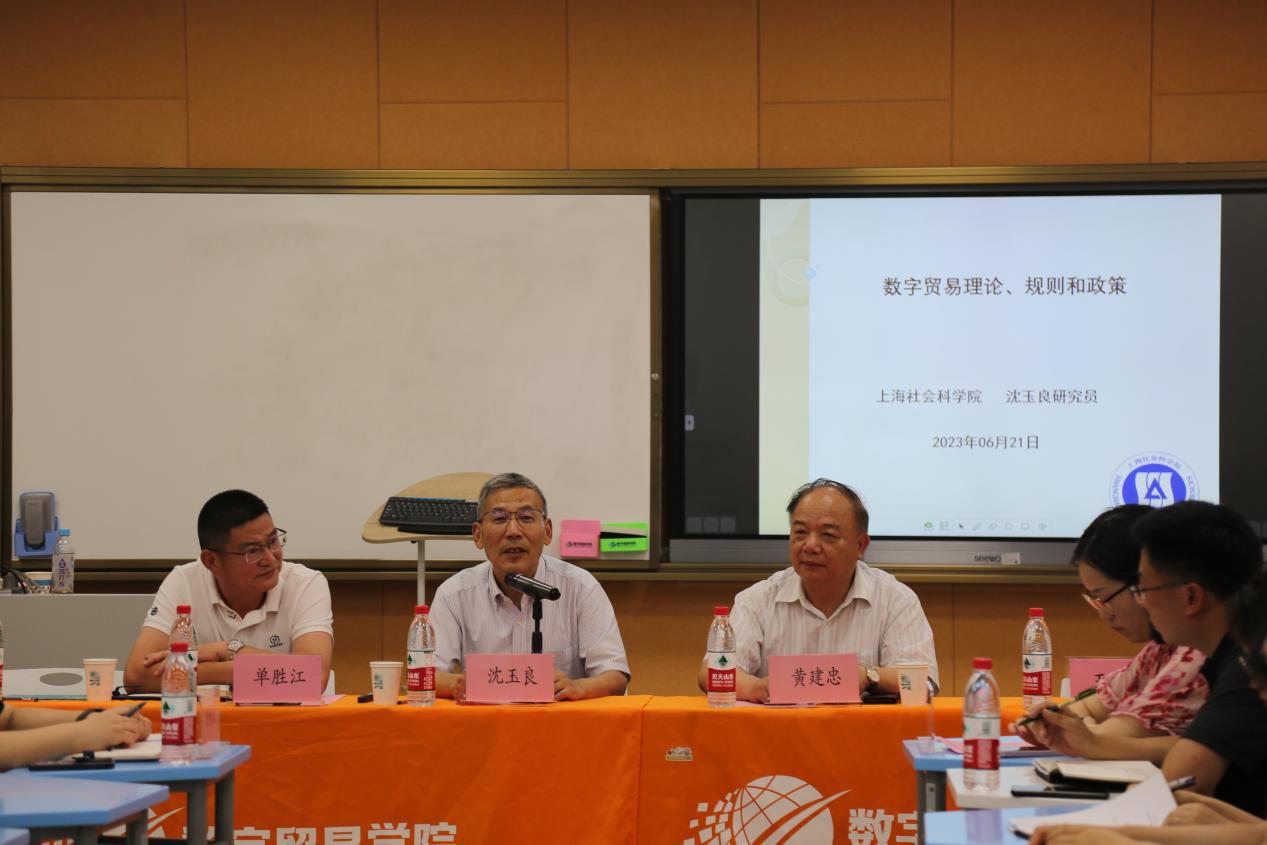 随着数字技术的不断发展,数字贸易已经成为全球经济的重要增长点,同时也带来了新的挑战和问题。为了探讨数字贸易领域的前沿理论和实践问题,6月21日下午,数字贸易学院邀请上海社会科学院世界经济研究所沈玉良教授在镜湖校区2-221智慧教室做“数字贸易理论、规则和政策”学术分享会。数字贸易学院院长单胜江、党委书记王庆军、副院长胡建海、党委副书记赵莹、院长助理章帷儿及全体系主任、教师参与。本次分享会由数字贸易研究中心主任黄建忠教授主持。