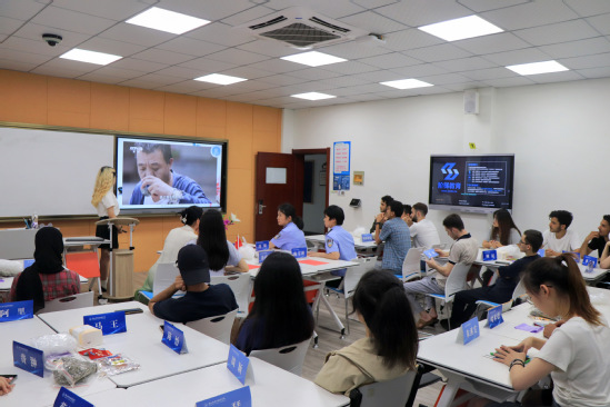 随后,主持人通过播放端午节视频,给留学生们讲解了端午习俗,包括划龙舟、祭龙、采草药、挂艾草、洗草药水、拜神祭祖、吃龙舟饭、食粽子、拴五色丝线、佩香囊等。看完视频,留学生们眼睛里充满了好奇与期待,耳畔仍回荡着“桃儿红,杏儿黄,五月五,是端阳”的童谣,个个跃跃欲试,想要抓紧进入到制作端午节香包的环节中。