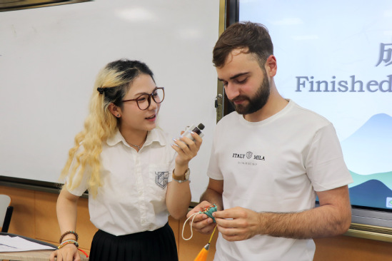 留学生们在制作香包的时候展现了极大的兴趣,有模有样地跟着DIY手工社团的工作人员学习制作。大家根据自己的喜好挑选布料,将艾草等草药放入香包中,再将其缝合。教室空气中夹杂着清凉的草木香和制作时的欢声笑语,那是专属于端午节的快乐。
