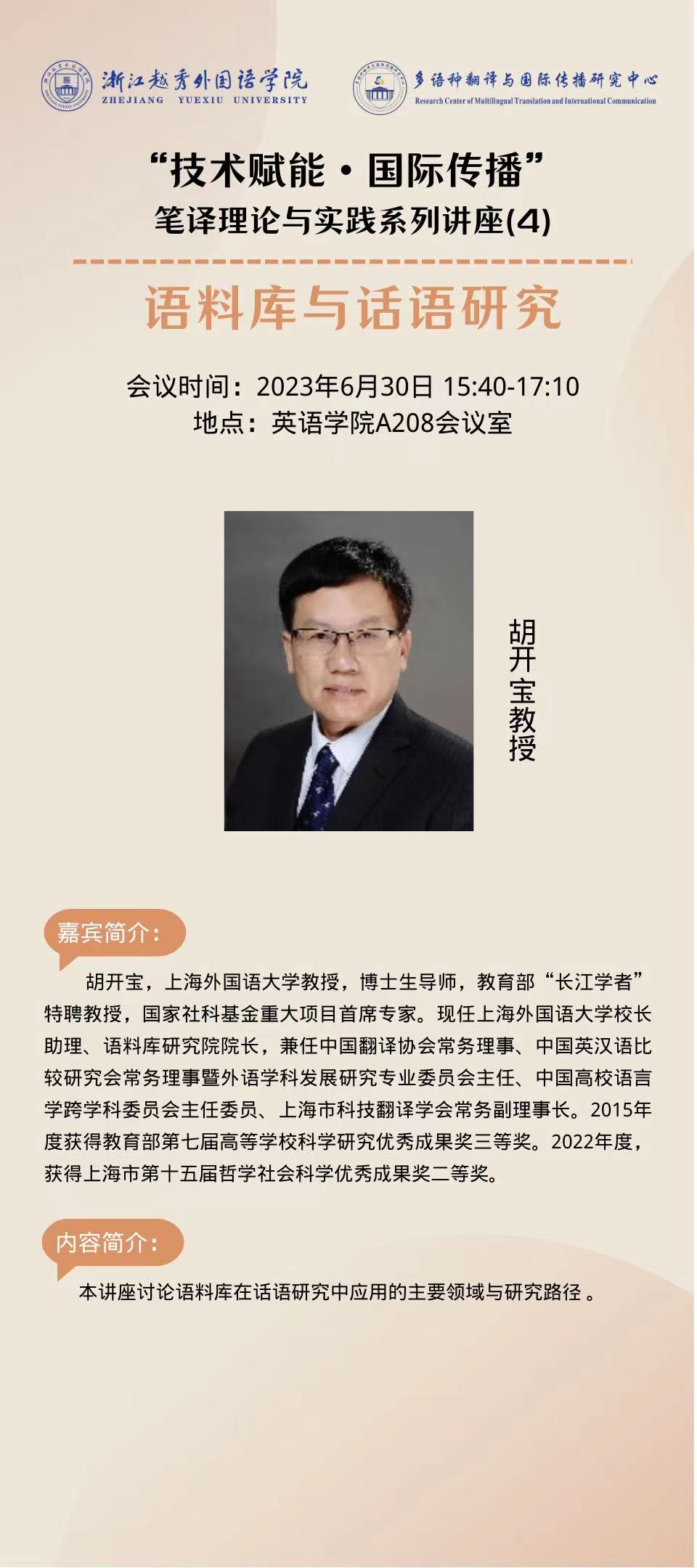 6月30日下午,英语学院邀请上海外国语大学胡开宝教授为足球一世官网师生开展了主题为“语料库与话语研究”的讲座。胡教授是上海外国语大学校长助理、语料库研究院院长,博士生导师,教育部“长江学者”特聘教授,国家社科基金重大项目首席专家。讲座由英语学院副院长谌莉副教授主持,参会教师包括《远东国际军事法庭庭审记录》翻译项目和语料库项目成员等相关教师20余人。