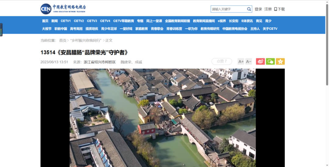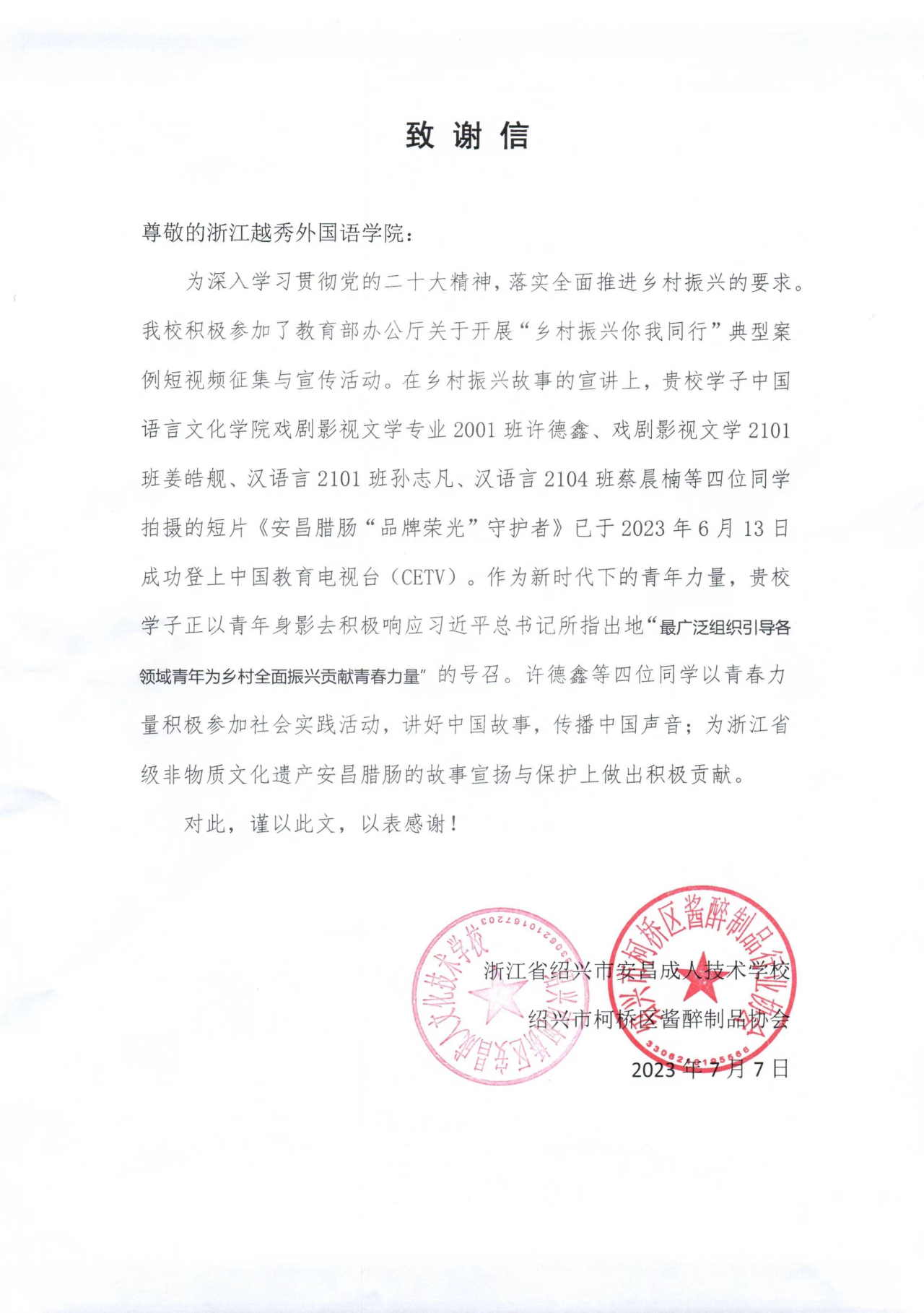 其中,我院戏剧影视文学专业2001班许德鑫、戏剧影视文学2101班姜皓舰、汉语言文学2101班孙志凡、汉语言文学2104班蔡晨楠等四位同学帮助浙江省绍兴市安昌成人文化技术学校拍摄的短片《安昌腊肠“品牌荣光”守护者》已于2023年6月13日成功登上中国教育电视台(CETV)。安昌成人技术学校和绍兴市柯桥区酱醉制品协会对我院学子积极协助拍摄表示了感谢。感谢信中提到:“作为新时代下的青年力量,许德鑫等四位同学积极响应习近平总书记所指出地‘最广泛组织引导各领域青年为乡村全面振兴贡献青春力量’的号召。”