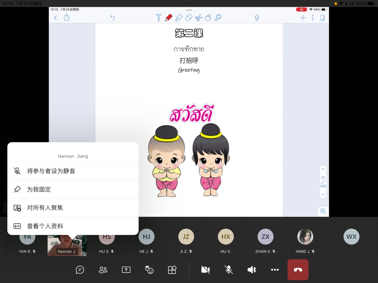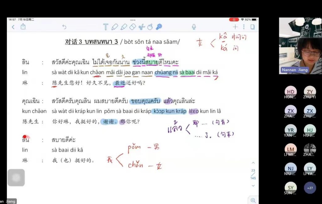 老师先介绍了如何用泰语打招呼,配有单词和课文。每个单词,句子上都有音译,可以让我们更快的掌握单词,句子的读法。老师教给我们的都是日常用语很快就能学会,虽然发音没办法那么准确,但是可以和泰国人做简单交流,以后旅游也会更加方便。老师非常负责,每个单词,句子都会亲自带我们读上好几遍,重点发音也会纠正。我们学了一些泰国著名的景点城市的读法,还有“这,那,我们,你等等”一些常用词的读法写法。还有一些发音的听说对我来说比较有难度,比如清辅音浊辅音的分辨,还有弹舌的发音。老师已经分享了教材,可以让我们及时的做笔记,课后复习。