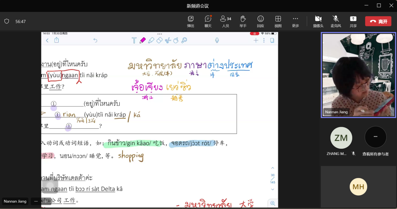 泰语课上老师提前上线,准备充分。虽然老师不会汉语,但是可以和我们进行英语交流,在学习新知识的时候还能巩固英语知识。