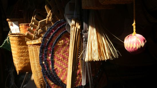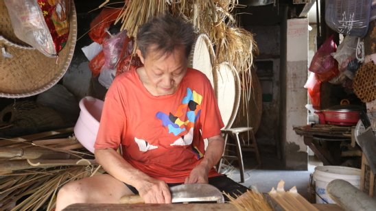 与前两者不同,楼爷爷属于传统印象中寄身街巷的传统手工艺人。窄小昏暗的店面前一根尼龙绳便是作品展示区,两把椅子就是他的工作台。“夏天属于淡季,人少了。游客多的时候卖的也多,喜欢的人也是有的”说到这,他笑开了,眼里有光。对于竹编,他怀有一腔诚意与耐心,等竹香四溢,等八方客来。