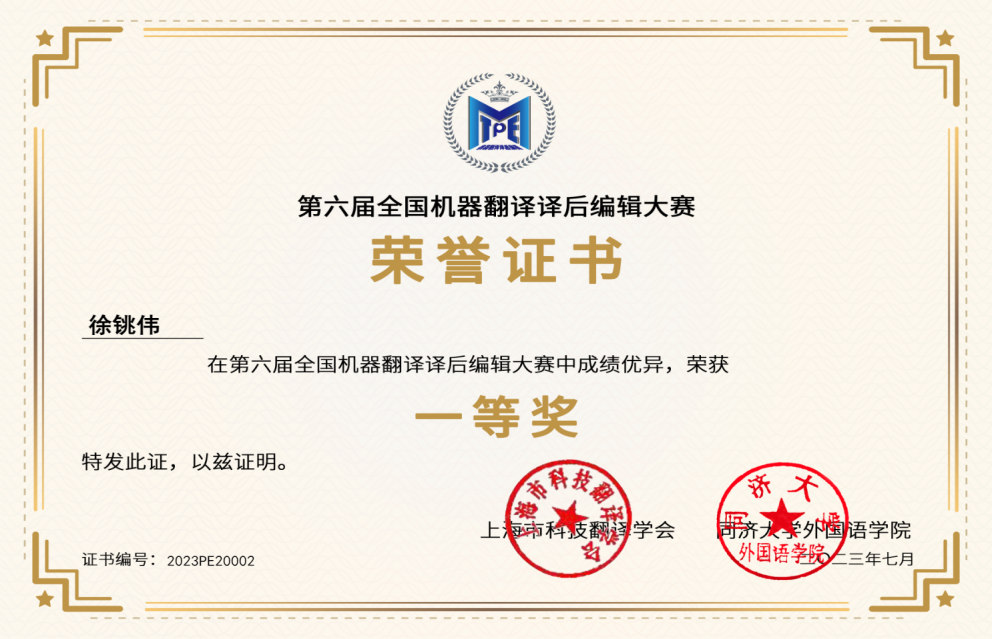 7月27日,“第六届机器翻译译后编辑大赛”圆满落下帷幕,我院新聘教师徐铫伟博士脱颖而出,斩获一等奖!