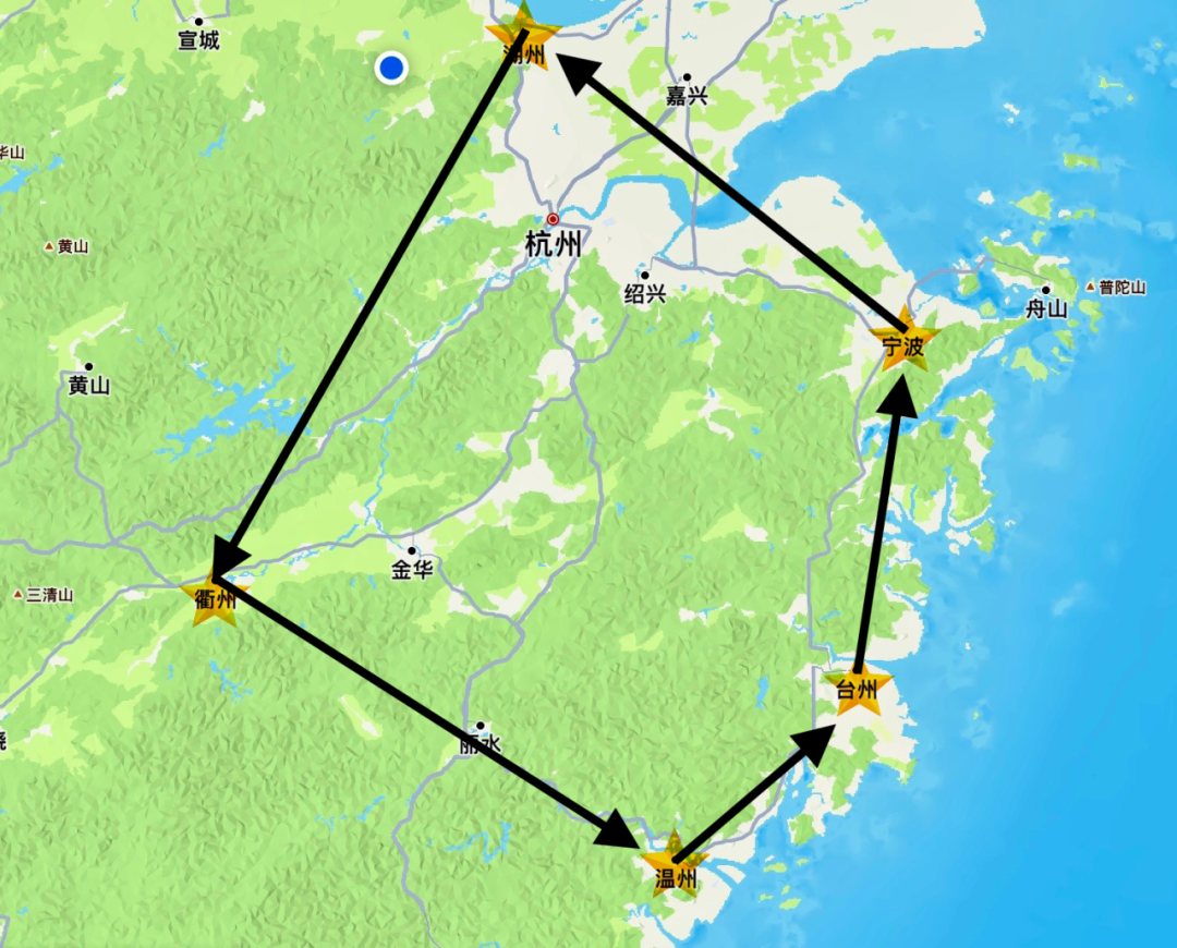 本次实践采用点亮浙江的形式,实践宣讲之地围绕成一个闭合图形,南至温州,北至湖州,他们是北纬28度至北纬30度的小小跨度,但却是星星之火蔓延的红色血迹。
