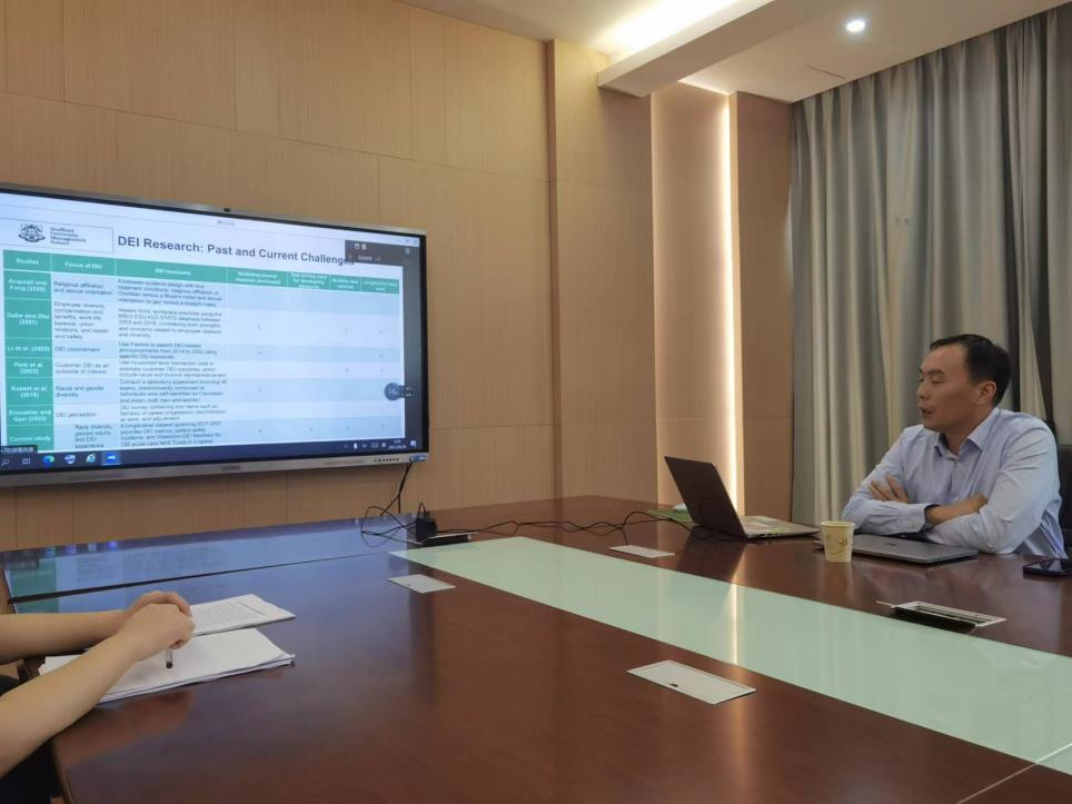 王教授分四个部分讲解。第一部分王教授向国际商学院的师生讲解了国际上学者们对DEI的定义,并详述DEI的多样性、公平性和包容性等特点。第二部分王教授介绍了国内外DEI的最新研究进展及其面临的挑战。第三部分王教授将DEI与医疗保健成果联系起来,指出这是他们团队目前所做的研究项目。第四部分王教授讲解了DEI的未来研究方向,如:构建劳动力DEI数据库、将DEI应用于消费者的研究、探索数字化技术如何助力DEI的发展等。