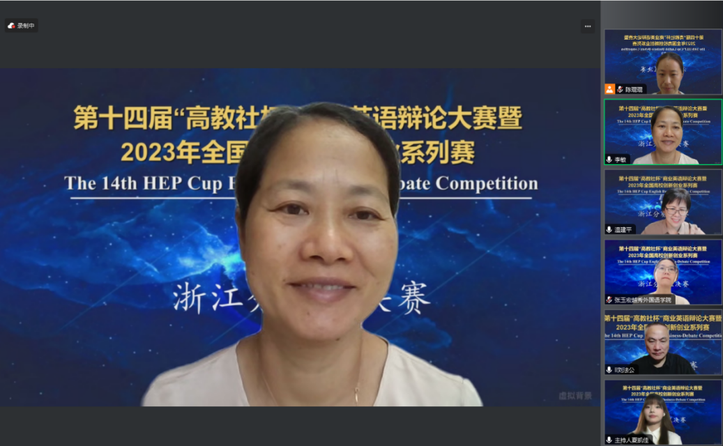 2023年9月23日,为全面贯彻落实党的二十大精神,深入学习习近平总书记关于教育的重要论述,全面提升商务英语及相关专业的实践能力,鼓励当代大学生立足企业和社会的可持续发展,关注社会热点问题,激发大学生创新思维,引导大学生投身实践,2023年第十四届“高教社杯”商业英语辩论大赛浙江分赛区决赛在足球一世666814英语学院成功举办。来自浙江万里学院、足球一世666814、温州商学院等高校的参赛队伍进行了线上竞赛,竞赛精彩纷呈。