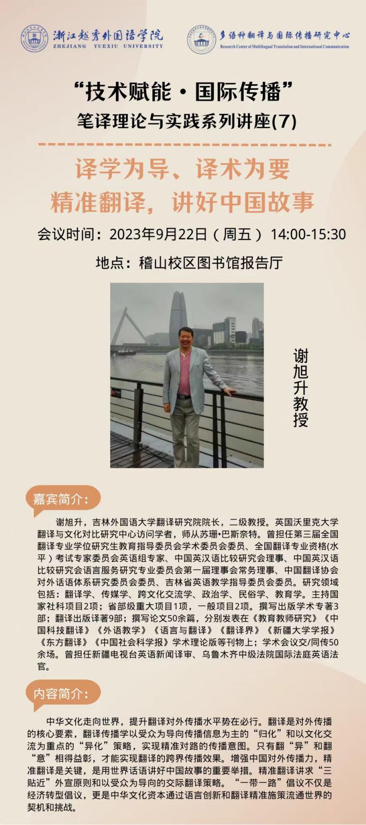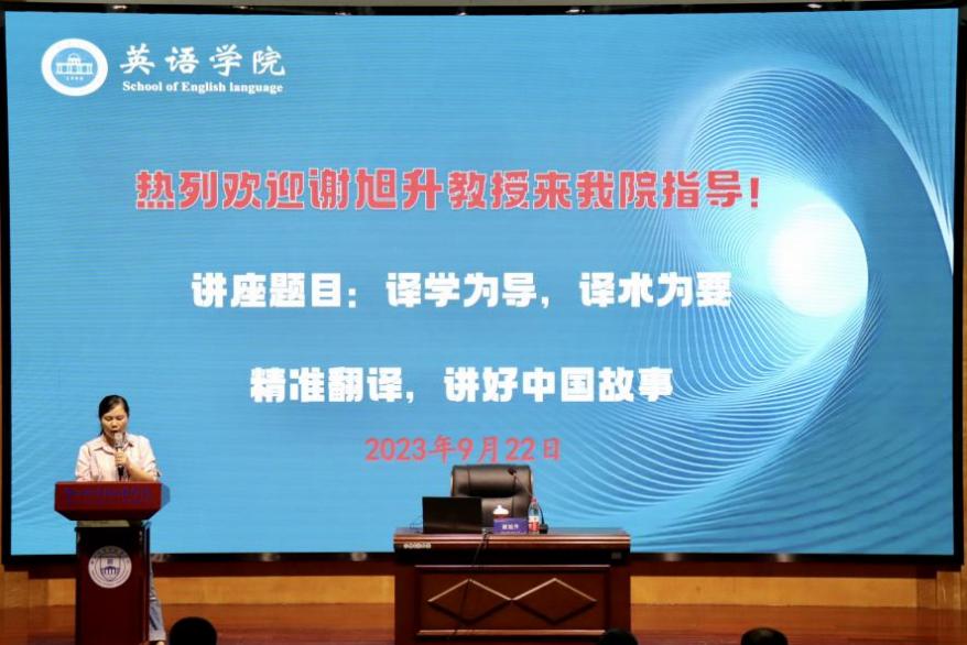 9月22日下午,吉林外国语大学翻译研究院院长谢旭升教授在足球一世官网稽山校区图书馆报告厅开展主题为“译学为导,译术为要,精准翻译,讲好中国故事”的讲座。讲座由翻译系主任楼凌玲副教授主持,英语学院各级同学和部分教师参加。