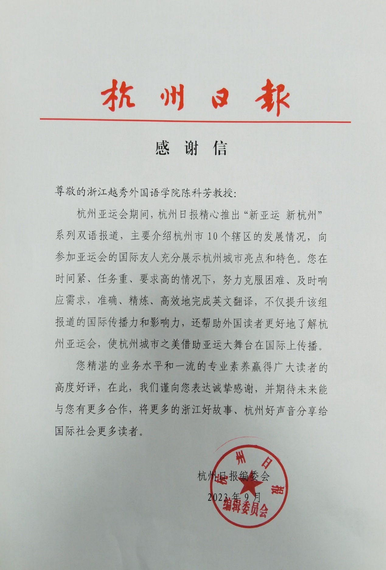 杭州亚运会期间,《杭州日报》推出了“新亚运 新杭州”系列文章,陈科芳教授在时间紧、任务重、要求高的情况下,成功翻译了杭州市10个辖区的介绍。此系列文章以连载形式,呈现在亚运期间的《杭州日报》上,不仅提升了国际传播力和影响力,杭州的优美风光也因此在亚运的大舞台上“走出去”。