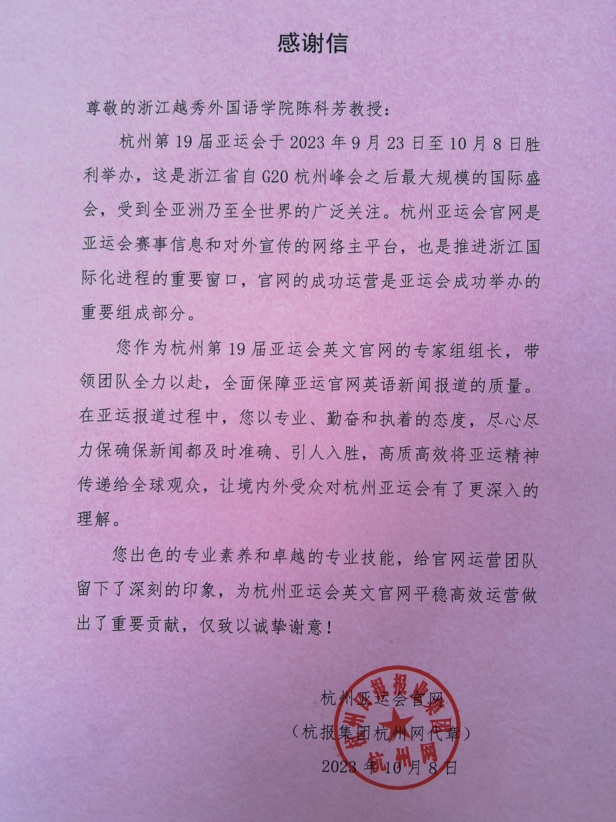 杭州亚运圆满落幕,我院教师与学生志愿者们全情投入服务亚运,其专业水平和敬业之心备受赞赏。他们的服务覆盖了赛会各领域,从语言支持到新闻传播,从场馆运作管理到赛事组织,凭借专业知识和热忱之情,为每一项任务的圆满执行而尽心尽力。其中,我院院长陈科芳教授的贡献尤为显著,获得了亚运会官网、杭州日报的一致感谢。